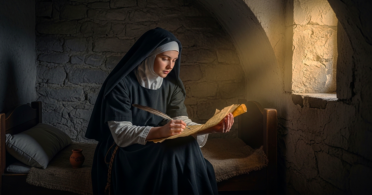 А тут - молодая девушка. В каменной келье размером с кладовку. Одна. Пергамент на ладони, чернила, которые нужно готовить самой, и свет, пробивающийся через узкую щель в камне.